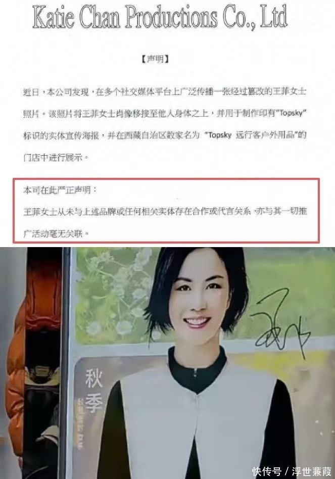 40. 有商家通过图像合成技术,将王菲的脸部强行移植到他人身体上,制作成带有“Topsky”标识的广告海报。