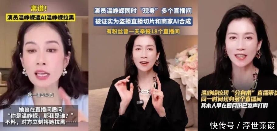 2. 后有温峥嵘被AI技术伪造“数字分身”,在多个直播间同时带货牟利,维权时反遭封禁拉黑。